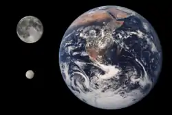 زمین و ماه آن (در بالا)در مقایسه با تتیس (در پایین سمت چپ)