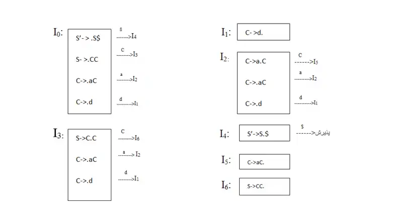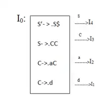 C →.aCدیده شود یا بر اساس C →.d، انتطار d را داریم. این عمل(قرار دادن نقطه و تعیین ترم انتظار)، تا جایی ادامه می یابد که به توکنها برسیم.(یعنی به a و d برسیم)این مورد را میتوان به صورت یک حالت موسوم به I0 نشان داد: