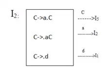 اما در I0 به جای d ممکن است که a از ورودی خوانده شود، که در این حالت آن را به پشته شیفت داده و به یک حالت جدید I2 انتقال می یابد. حالت I2 به صورت C →.aC در میآید، که نقطه نشان دهندهٔ این است که پس از a انتظار دیدن C را داریم، امل برای تشخیص C، براساس قواعد آن، انتظار داریم که یا a یا d در ورودی بخوانیم، پس حالت I2 به صورت زیر است: