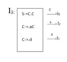 اما در حالت I0 درS → .CC اگر C تشخیص داده شود به حات جدید I3 انتقال می یابیم که این را با goto 3 نشان میدهیم.(goto برای متغیر میانی استفاده میشود) در این حالت در I3 به وضیعتی مانند S → C.C میرسیم، یعنی C اول تشخیص داده شده و اکنون دوباره انتظار دیدن C دیگری داریم که برای تشخیص آن دوباره یا انتظار aیاd را بر اساس قواعد C داریم، وضعیت I3 در زیر نشان داده شدهاست: