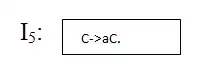 اکنون نوبت به حالت I2وI3 است تا مشخص کنیم که چه اتفاقی در آن حالت می افتد، در حالت I2، چنانکه دیده میشود، انتظار توکن d وجود دارد، در صورتی که این توکن خوانده شود، آن را به درون پشته شیفت داده و به حالت I1 انتقال میدهیم، توجه کنید که در حالت به دست آمده، نباید حالات تکراری وجود داشته باشد. اما با دیدن توکن a، پس از shift a به درون پشته، دوباره به همین حالات I2 میرسیم و در نهایت با تشخیص C، به یک حالت جدیدI5 تغییر حالت میدهیم (goto 5)، حالت I5 به صورت مقابل است و معنی آن کاهش بر اساس قاعده شماره 2 میباشد، و به ازایfollow سمت چپ حالت I5 یعنی C عمل R2 را انجام میدهیم.