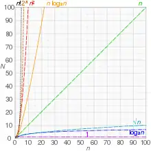 ُیعنی آهنگ رشد تابع برای مقادیر بزرگ n، بیشتر یا مساوی آهنگ رشد تابع است. در این صورت میگوییم تابع کران بالای مجانبی برای است و معمولاً به کار میبریم: [12]
