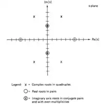 ب- ریشههای روی محور موهومی صفحهٔ sبه صورت مضارب زوج از جفت مزدوج مختلط هستند.]یعنی اگر jw1 یک ریشهٔ f(s) باشد، آنگاه jw1 و(jw1) ریشههای دوتایی یا چهارتایی یا… f(s) هستند[