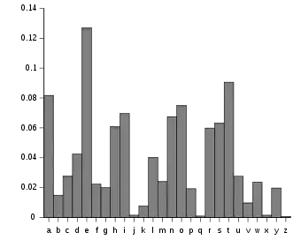 مشارکتکنندگان ویکیپدیا. «Frequency analysis». در دانشنامهٔ ویکیپدیای انگلیسی، بازبینیشده در ۲۲ می ۲۰۲۰.