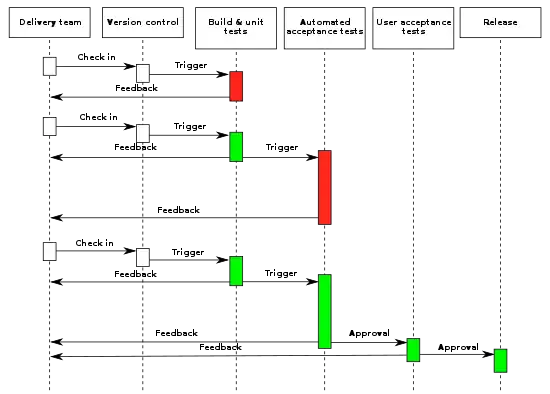 تحویل مداوم ، مفهوم رایج خط لوله استقرار را به عنوان پیشگیری از خطای سهوی و ناب در نظر می گیرد:[11] مجموعهای از اعتبارسنجیها که یک نرمافزار در مسیر عرضهاش باید سپری کند. کد درصورت نیاز باید کامپایل شود و پس از آن هر دفعه که تغییری در مخزن ثبت ثبت میشود توسط سرور ساخت (build) بستهبندی شود. در مرحله آخر نیز این کد باید توسط تکنیکهای متنوع تست شود تا از آمادگی آن برای عرضه اطمینان حاصل شود.