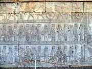 در سنگ نگارهای تختجمشید فاصله هر ملت به وسیلهٔ یک درخت سرو، که درخت مقدس میباشد، جدا شدهاست. درجهبندی نمایندگان ملل بر پایه فرهنگ و سابقه یا دوری و نزدیکی آنهاست مانند مادها، ایلامیها، خوزیها، بابلیها، آشوریان.[52]