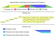 بهترین مورد برای بررسی از مقیاس گام تخت جمشیدی، پلکان شرقی آپادانا است که در یک نظر رابطه منطقی طول و عرض قسمتهای آن بدین صورت مشخص میشود: