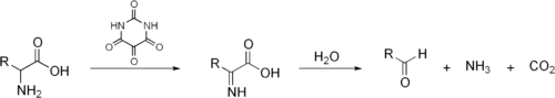 در واکنش اصلی که توسط اشترکر توصیف شد از آلوکسان به عنوان عامل اکسنده در مرحله اول استفاده میشود،[1] سپس با آبکافت گونه واسط، محصول نهایی تولید میشود: