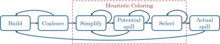فرض کنید که به تعداد ثباتهای ماشین رنگ در اختیار داریم. حال با این رنگها به رنگآمیزی گراف برخورد میپردازیم. اگر در نهایت به یک رنگآمیزی معتبر رسیدیم، هر دو راس مجاور رنگهای متفاوتی خواهند داشت و این بدین معنا است که هر دو متغیر همزمان زنده در ثباتهای مختلفی قرار میگیرند و با یکدیگر برخوردی نخواهند داشت. اما از آنجا که مسئلهٔ رنگآمیزی گراف انپی کامل است، از یک روش مکاشفهای برای تخصیص ثبات استفاده میشود. در شکل زیر بهطور خلاصه پیادهسازی تخصیص ثبات با استفاده از رنگآمیزی گراف را مشاهده میکنید.