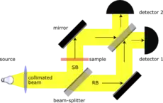 اگر شکافندههای پرتو B1، B2 و آینههای M1، M2 کاملاً موازی باشند، اختلاف راه بین دو پرتوی شکافته شده به زاویة فرودی α بستگی ندارد چون اختلاف راه بین دو پرتوی ۱ و ۳ دقیقاً با طول راه پرتوی ۴ بین M2 و B2 جبران میشود (شکل ۴–۳۰- الف). به تعبیر دیگر امواج تداخلکننده در یک تداخل سنج متقارن (بدون حضور نمونه) اختلاف راه یکسانی را در مسیر ثابت (مسیر خطچین در شکل ۴–۳۰- الف) تجربه میکنند؛ بنابراین بدون حضور نمونه، اختلاف راه کل صفر است؛ این اختلاف راه در حضور نمونهای با ضریب شکست n در یک بازوی تداخل سنج برابر Δs=(n-1)L میشود.