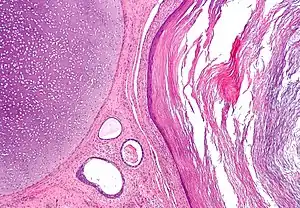 | عکاسی ریزنگاری of a teratoma showing tissue from all three germ layers: mesoderm (immature cartilage - left-upper corner of image), endoderm (gastrointestinal glands - center-bottom of image) and ectoderm (epidermis - right of image). H&E stain. | |