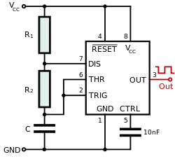 - مُد آستابل (free-running): تراشه ۵۵۵ میتواند به عنوان یک نوسانگر عمل کند. مانند مدارات LED و فلاشرهای لامپی، مولد پالس ساعت، تولید صدا (آژیر)، مدولاسیون زمان پالس و ... ۵۵۵ میتواند به عنوان یک مبدل آنالوگ به دیجیتال ساده استفاده شود (تبدیل مقدار آنالوگ به طول پالس). برای نمونه، انتخاب مقاومت گرمایی به عنوان مقاومت زمانبندی به ۵۵۵ اجازه میدهد تا دما را اندازهگیری کند: دوره پالس خروجی به عنوان دما در نظر گرفته میشود. سپس با استفاده از سیستم برپایه میکروپروسسور میتوان دوره پالس را به دما تبدیل نموده، و با خطیسازی آن را تنظیم کرد.