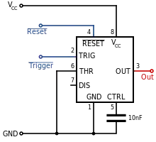 | ۸ | Vcc | سر مثبت منبع تغذیه، که معمولاً بین ۳ و ۱۵ ولت بسته به نوع آیسی متغیر است. |