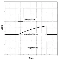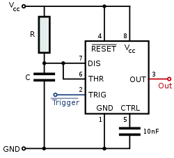 که t به ثانیه، R به اهم و C به فاراد است. هنگام استفاده از تراشه زمانسنج در حالت مونواستابل، ضعف اصلی این است که بازه زمانی بین دو پالس تریگ باید از ثابت زمانی RC بیشتر باشد.