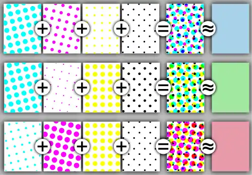 * الگوی رنگی حاصله که چشمان انسان در فاصل معین رویت میکند که سه رنگ جدید میباشند.