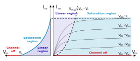 جایی که Vp ولتاژ مصرف شدهاست، حداقل ولتاژ از گیت –سورس برای بهطور کامل خاموش کردن، عبور میکند. هنگامی که در مقایسه با - کوچک است، دستگاه مانند یک مقاومت کنترل شده باولتاژ عمل میکند.