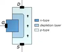 هنگامی که یک ولتاژ به گیت اعمال شدهاست، جریان الکتریکی از سورس به درین در یک JFET کانال p محدود میشود.