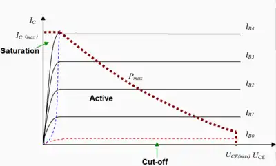 برای رسیدن به وضعیت اشباع، با توجه به اینکه در ترانزیستور رابطهٔ برقرار است، پیوند بیس-امیتر را در بایاس موافق قرار میدهند تا جریان کلکتور به حداکثر مقدار خود برسد، در این حالت ولتاژ دو سر پایههای کلکتور و امیتر به صفر میرسد و اگر مصرفکننده در کلکتور باشد جریان کلکتور از آن نیز خواهد گذشت، در این حالت ترانزیستور مانند یک کلید بستهاست و میگویند ترانزیستور در حالت اشباع قرار دارد. برای رسیدن به حالت قطع، جریان بیس را صفر میکنند تا به تبع آن جریان کلکتور صفر شود، در این حالت دو سر پایههای کلکتور و امیتر مانند یک کلید باز عمل میکند و اگر مصرفکنندهای در مسیر کلکتور قرار داشته باشد هیچ جریانی از آن عبور نخواهد کرد.[7]