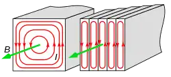 مواد فِرّومغناطیسی معمولاً هادیهای الکتریکی خوبی نیز هستند و بنابراین هسته ترانسفورماتور میتواند مانند یک مدار اتصال کوتاه شده عمل کند؛ بنابراین حتی با القای میزان کمی ولتاژ، جریان در هسته به شدت بالا میرود. این جریان جاری در هسته گذشته از به وجود آوردن تلفات الکتریکی موجب به وجود آمدن حرارت در هسته نیز میشود. جریان گردابی در هسته با مجذور بسامد منبع رابطه مستقیم و با مجذور ضخامت ورق هسته رابطه معکوس دارد. برای کاهش تلفات گردابی در هسته، هستهها را ورقه ورقه کرده و آنها را نسبت به یکدیگر عایق میکنند. اساس کار کورههای القایی، جریانهای گردابی است.