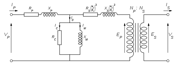 محدودیتهای فیزیکی یک ترانسفورماتور واقعی به صورت یک مدار نمایش داده میشوند. این مدار معادل از تعدادی از عوامل به وجود آورنده تلفات یا محدودیتها و یک ترانسفورماتور ایدئال تشکیل شدهاست. تلفات توان در سیمپیچ یک ترانسفورماتور بهطور خطی تابعی از جریان هستند و به راحتی میتواند آنها را به صورت مقاومتهایی سری با سیمپیچهای ترانسفورماتور نمایش داده شود؛ این مقاومتها RS و RP هستند. با بررسی خواص شار پراکندگی میتوان آن را به صورت خود القاهای XP و XS نشان داد که به صورت سری با سیمپیچ ایدئال قرار میگیرند. تلفات آهنی از دو نوع تلفات گردابی (فوکو) و پسماند (هیسترزیس) تشکیل شده. در بسامد ثابت این تلفات با مجذور شار هسته نسبت مستقیم دارند و از آنجایی که شار هسته نیز تقریباً با ولتاژ ورودی نسبت مستقیم دارد این تلفات را میتوان به صورت مقاومتی موازی با مدار ترانسفورماتور نشان داد. این مقاومت همان RC است.