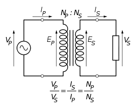 معادلهٔ زیر بیان میکند که نسبت ولتاژ سیمپیچ اولیه (Vp) به ولتاژ سیمپیچ ثانویه (Vs) با نسبت تعداد دور سیمپیچ اولیه (Np) به تعداد دور سیمپیچ ثانویه (Ns) رابطهٔ مستقیم دارد: