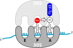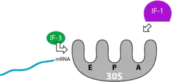در بالادست ناحیه قاب خواندن باز توالی کوتاهی به نام «شاین دالگارنو» وجود دارد که جایگاه اتصال بخش ۱۶S ریبوزوم است. توالی این بخش ریبوزوم به صورت ۳ ۵CCUCCU است و نحوه اتصال به شکلی است که هنگام اتصال زیرواحد بزرگ به همآرا، رمزه آغاز در جایگاه Pریبوزوم قرار گیرد. در این مرحله فاکتورهای برگردان نقش عمدهای دارند به طوریکه IF۱ مانع از اتصال رنای ناقل به ناحیهای از زیرواحد کوچک میشود که بخشی از جایگاه A است. IF۲ یک GTPase است و با IF۱ و رنای ناقل آغازگر میانکنش میدهد و سبب تسهیل اتصال رنای آغازگر و مانع از اتصال سایر رناها به زیرواحد کوچک میشود. IF۳ به زیرواحد کوچک متصل میشود و مانع از اتصال دوباره آن به زیرواحد بزرگ میشود و با اتصال به ریبوزوم ۷۰S، کمک میکند تا زیرواحدهای کوچک و بزرگ خود تفکیک شود. با اتصال زیرواحد بزرگ به همآرا، تغییر ساختمانی در زیرواحد کوچک اعمال میشود که سبب آزاد شدن IF۳ میشود. در غیاب این فاکتور زیرواحد بزرگ میتواند به زیرواحد کوچک متصل شود. این امر سبب تجزیه GTP توسط خاصیت GTPase فاکتور IF۲ میشود. ادامه: