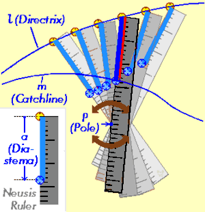 تثلیث زاویه ی θ > ۱۳۵° با استفاده از روش درج. شعاع کمان برابر طول پاره خط تعیین شده روی ستاره است (پاره خط PA در شکل). برای زوایای θ < ۱۳۵° روش ترسیم مشابهی وجود دارد.