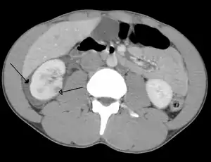 | ترومای شکم باعث کوفتگی در کلیه شده و خونریزی(نوک پیکان) در اطراف کلیه در سیتیاسکن دیده میشود. | |