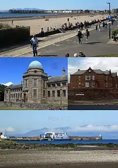![]() Clockwise from top: Troon South Beach, Troon Primary School, Troon Harbour, P&O port and Marr College | |