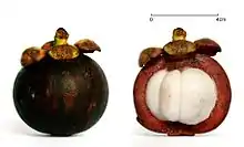 ![]() Purple mangosteen fruit exterior and in cross-section | |