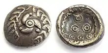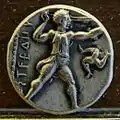 اسلینگر ایستاده، تریسکلیون از چپ به راست. یک بیان کننده معکوس باستانی نقره یونانی از آسپندوس، پام فیلیا