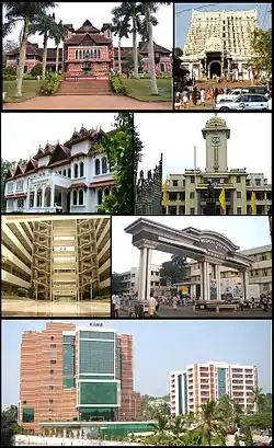 ![]() From top clockwise: Napier Museum, Padmanabhaswamy Temple, University of Kerala, Government Medical College, Kerala Institute of Medical Sciences, Bhavani building in Technopark and The Oriental Research Institute & Manuscripts Library | |||||||||