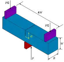 در رابطه بالا، P بار اعمال شده، B ضخامت نمونه ، a طول ترک و W عرض نمونه است. در یک آزمون خمشی سه نقطه ای، شکاف مورد نظر، به وسیله یک بارگذاری چرخه ای و در اثر خستگی نمونه در محل مورد نظر ایجاد می شود. طول ترک اندازه گیری می شود، سپس نمونه به صورت یکنواخت تحت بارگذاری قرار می گیرد. برای تعیین نیرویی که ترک در آن شروع به رشد می کند از نمودار بار-جابجایی دهانه ترک استفاده می شود. این نیرو برای یافتن مقاومت در برابر شکست ماده، در فرمول زیر استفاده می شود: