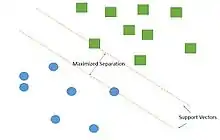 ماشین بردار پشتیبان، طبقهبندی است که در بیش از ۹۰٪ موارد برای تقطیع استفاده میشود.[59] SVM، یک مدل یادگیری تحت نظارت از تکنیکهای بازشناسی الگو است. الگوریتم آن از طریق ایجاد بزرگترین شکاف بین نمونههای داده عمل میکند. هدف، ایجاد بزرگترین شکاف بین این اجزا، به منظور حداقل کردن خطای طبقهبند است.[60] الگوریتم SVM، جهت جدا کردن اطلاعات مربوط به رگهای خونی، بردارهای پشتیبانی ایجاد میکند که در محیطی نظارت شده، پیکسلهای رگها را از سایر قسمتهای تصویر تفکیک میکند. شناسایی رگهای خونی در تصاویر جدید، به روش مشابه و با استفاده از بردارهای پشتیبان انجام میشود. ترکیب این روش با سایر تکنیکهای پیش پردازش، مانند فیلتر کانال سبز، صحت تشخیص رگهای خونی غیرطبیعی را بهبود میبخشد.[53] برخی از مزایای SVM عبارتند از:[60]