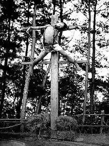در این نوع اعدام، مجرم را به وسیله طناب و سه میخ بزرگ در دستها و پاها (دو میخ در مچ دو دست و یک میخ برای رو هر دو پا) به صلیبهایی با ارتفاع عمومی ۵-۶ متر از سطح زمین میبستند. سپس صلیب را بر پا کرده در زمین محکم مینمودند. قربانی سپس در همان حال رها میشد و در نهایت به خاطر خونریزی شدید، گرسنگی و تشنگی، حمله پرندگان و سایر عوامل جان میسپرد. سپس مأموران اعدام، ساق پاهای جسد را با وسایلی میشکستند و آن را از صلیب جدا کرده پایین میآوردند. جسد در نهایت به دست خانواده یا مأموران دولتی به خاک سپرده میشد.