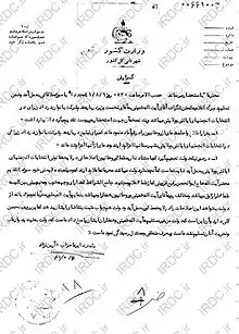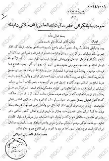 "... از نظر علاقه به حفظ مصالح عالیه دین مبین اسلام و امنیت و استقلال مملکت و عطف توجه خاص مملوکانه در مورد بعض مقررات که از طرف دولت به عنوان لایحه قانونی صادر میشود معروش میدارد تصویب نامه لایحه انجمنهای ایالتی و ولایتی که در مواد آن مصالح مملکت و انطباق با قوانین محکمه شرع مقدس حضرت ختمی مرتبت صلی الله علیه و آله و سلم رعایت نشده مخصوصاً در مورد شرط اسلام و مرد بودن انتخابکننده و انتخاب شونده باعث نگرانی و سوء انعکاس است مستدعی است با اهتمامی که همواره به حفظ جهات اسلامی و مملکتی اظهار فرمودهاید دولت را از این گونه اقدامات ممنوع و امر به مراعات جهات اسلامی را در کلیه امور مملکتی صادر فرمایید…"[7]