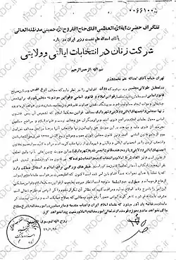 «تهران جناب آقای اسدالله علم تعطیل طولانی مجلسین دیده میشود که دولت اقداماتی را در نظر درد که مخالف شرع اقدس… قانون اساسی است مطمئن باشید تخلف از قوانین اسلام و قانون اساسی و قوانین موضوعه مجلس شوری برای شخص جنابعالی و دولت ایجاد مسئولیت شدید در پیشگاه مقدس خداوند قادر قاهر و نزد ملت مسلمان و قانون خواهد کرد. ورود زنان به مجلسین و انجمنهای ایالتی و ولایتی و شهرداری مخالف قوانین محکم اسلام که تشخیص آن به نص قانون اساسی محول به علمای اعلام و مراجع فتواست و برای دیگران حق دخات نیست و فقهاء اسلام و مراجع مسلمین به حرمت آن فتوا داده و میدهند در این صورت حق رأی دادن به زنها و انتخاب آنها در همه مراحل مخالف نص اصل دوم از متمم قانون اساسی است… و نیز قانون مجلس… انتخاب کردن در انجمنهای ایالتی و ولایتی و شهرداری را از زنان سلب کردهاست…»[11]