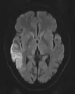 رایجترین کاربرد DW-MRI در تصویربرداری از مغز بلافاصله پس از انفارکسیون است، یا بهطور دقیقتر پس از حالت ایسکمی که در آن بافتهای شرکت کننده، آبهای جذب شده از فضای خارج سلولی را از دست بدهند. این مدت معمولاً چند روز پس از واقعه ایسکمی بتدریج رخ میدهد. در این مدت، خاصیت پخشی بافتها حالتی محدود داشته، و ADC بافتها کاهش مییابد. در نتیجه بافت صدمه دیده دارای شدت سیگنال بیشتری میشود (تصویر مقابل)، و میتوان از این خاصیت برای تمیز دادن از بافتهای سالم استفاده کرد.