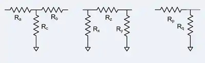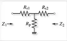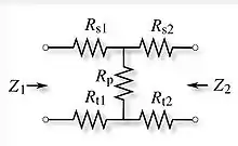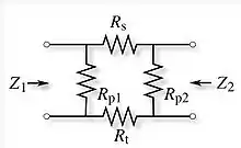 - همیشه میتوان یک پد t مقاومتی را به عنوان دودهانه نشان داد. نمایش به ویژه با استفاده از پارامترهای امپدانس ساده است: