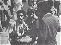 ![]() نظامیان ارتشی گرداگرد عدهای از مردمی هستند که تحت محاصره آنها کشته شدهاند | |