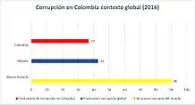 براساس شاخص احساس فساد ۲۰۱۸ که توسط شفافیت بینالملل برای سنجش فساد در بخش دولتی و در ۱۸۰ کشور و سرزمین تاکنون منتشر شدهاست، و با شاخص از صفر (بسیار فاسد) تا ۱۰۰ (بسیار تمیز) متمایز میشود، رتبه کلمبیا به لحاظ فساد ۳۶ است. این کمتر از میانگین جهانی رتبه ۴۳ است و کلمبیا را به ۹۹مین کشور فاسد جهان تبدیل کردهاست.[6]