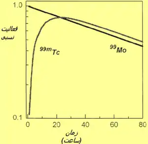 نمودار فعالیتهای نسبی مولیبدنوم متا و تکنیتیوم، نمونهای از تعادل گذرا.