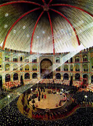 تعزیه اما در دورهٔ ناصرالدین شاه به اوج خود رسید و بسیاری این دوره را عصر طلایی تعزیه نامیدهاند. تعزیه که پیش از آن در حیاط کاروانسراها، بازارها و گاهی منازل شخصی اجرا میشد، اینک در اماکن باز یا سربستهٔ تکایا و حسینیهها به اجرا درمیآمد. معروفترین و مجللترین این تکایا، تکیهٔ دولت بود که در همین دوره به دستور ناصرالدین شاه و مباشرت دوستعلیخان معیرالممالک در سال ۱۳۰۴ هجری قمری ساخته شد.[16] تکیهٔ دولت در زمان ناصرالدین شاه به تقلید از تماشاخانه اپراهال انگلستان ساخته شد که ابتدا به منظور یک سالن تئاتر ساخته شد اما با مخالفتهایی که بود به تکیه تبدیل شد. از دیگر تکیههای معروف آن زمان تکیهٔ معاونالملک در کرمانشاه بود.[17] در آغاز سلطنت ناصرالدین شاه، تعزیه در ۳۰۰ مکان مشخص برپا میشد.[18] تعزیه تا زمان مشروطیت در اوج ماند.[19]