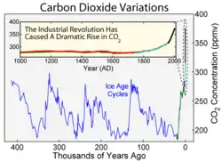 طی دوران جدید، بالا رفتن سطوح دیاکسید کربن به عنوان عامل اصلی محسوب میشود که موجب گرم شدن جهان از سال ۱۹۵۰ تاکنون شدهاست.[9]