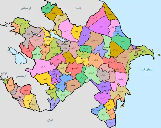 - مشارکتکنندگان ویکیپدیا. «Administrative divisions of Azerbaijan». در دانشنامهٔ ویکیپدیای انگلیسی، بازبینیشده در ۲۶ فوریه ۲۰۱۴.