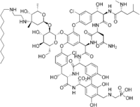 (1S,2R,18R,19R,22S,25R,28R,40S)-22-(2-Amino-2-oxoethyl)-5,15-dichloro-48-{[2-O-(3-{[2-(decylamino)ethyl]amino}-2,3،6-trideoxy-3-methyl-α-L-lyxo-hexopyranosyl)-β-D-glucopyranosyl]oxy}-2,18,32,35,37-pentahydroxy-19-[(N-methyl-D-leucyl)amino]-20,23,26,42,44-pentaoxo-36-{[(phosphonomethyl)amino]methyl}-7,13-dioxa-21,24,27,41,43-pentaazaoctacyclo[26.14.2.23,6.214,17.18,12.129,33.010,25.034,39]pentaconta-3,5،8(48),9،11,14,16,29(45),30,32,34,36,38,46,49-pentadecaene-40-carboxylic acid | |