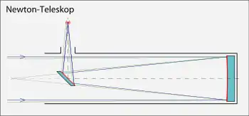 در این نوع تلسکوپ، نور جمعآوری شده به وسیلهٔ یک آیینهٔ کاو (مقعر)، با یک آینهٔ ثانویهٔ تخت یا منشور به بیرون از لولهٔ تلسکوپ هدایت شده و به عدسی چشمی ارسال میشود. اگرچه تلسکوپهای نیوتنی از انواع شکستی کوتاهترند، ولی همچنان از مدلهای جدیدتر کسگرین یا اشمیت-کسگرین بلندتر و سنگینتر هستند.