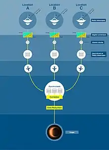 EHT از تعداد بسیاری از رصدخانههای رادیویی یا تلسکوپهای رادیویی در سراسر جهان تشکیل شدهاست تا کار یک تلسکوپ بزرگ (بهاندازهٔ زمین) را حساسیت بالا و با رزولوشن بالا را پدیدآورد. با استفاده از تکنیک تداخل سنجی بسیار طولانی پایه (VLBI)، بسیاری از آنتنهای رادیویی مستقل که توسط صدها یا هزاران مایل فاصله از هم جدا شدهاند و میتوانند به صورت همزمان برای ایجاد یک تلسکوپ مجازی با قطر مؤثر کل سیاره مورد استفاده قرار گیرند.[10] این تلاش شامل توسعه و استفاده از گیرندههای قطبی دوگانه زیرمیلیمتر، استانداردهای فرکانس بسیار پایدار است که امکان اتصال به تداخلسنجی بسیار طولانی در ۲۳۰–۴۵۰ گیگاهرتز، پشت صحنه و ضبط کننده VLBI با پهنای باند بالا و همچنین راهاندازی سایتهای جدید (VLBI submillimeter) را فراهم میکند.