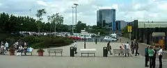 ![]() The Town Centre viewed from the western end of Telford Shopping Centre، with the blue Telford Plaza buildings in the distance. | |