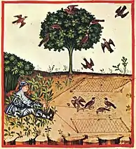 نقاشی از قرن چهاردهم میلادی، مردی در حال شکار پرندگان با استفاده از تله.